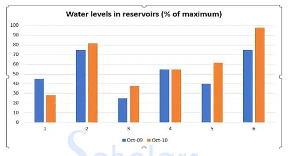 12. The chart shows the water levels of 6 cities in Australia {Darwin (1), Sydney (2), Melbourne (3). Brisbane (4), Perth (5) and Canberra (6)} in October 2009 and October 2010
