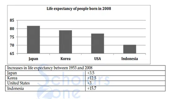 03. The bar chart gives information about the life expectancy in Japan, Korea, the United States, and Indonesia, and the table shows the change in life expectancy between 1953 and 2008.