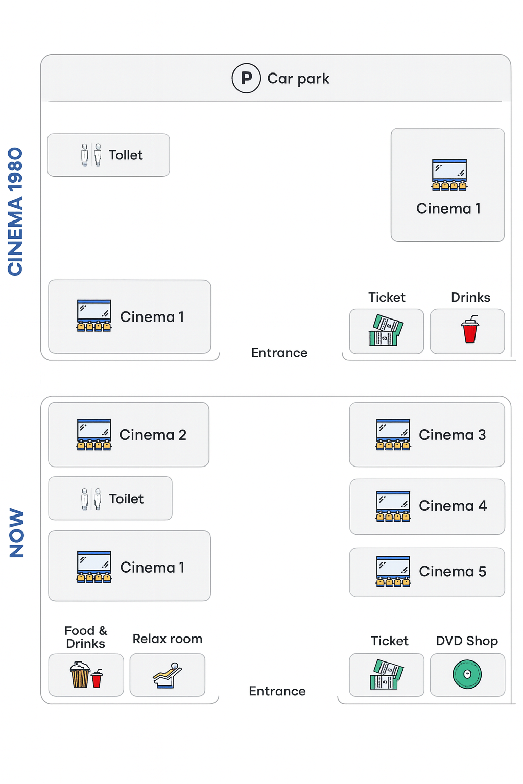 The pictures show the layout of a cinema in 1980 and the same cinema now.
