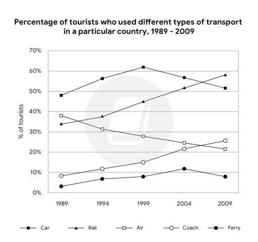 The graph below shows the percentages of tourists who used different types of transport to travel within a particular nation between 1989 and 2009. Each tourist may have used more than one type of transpor