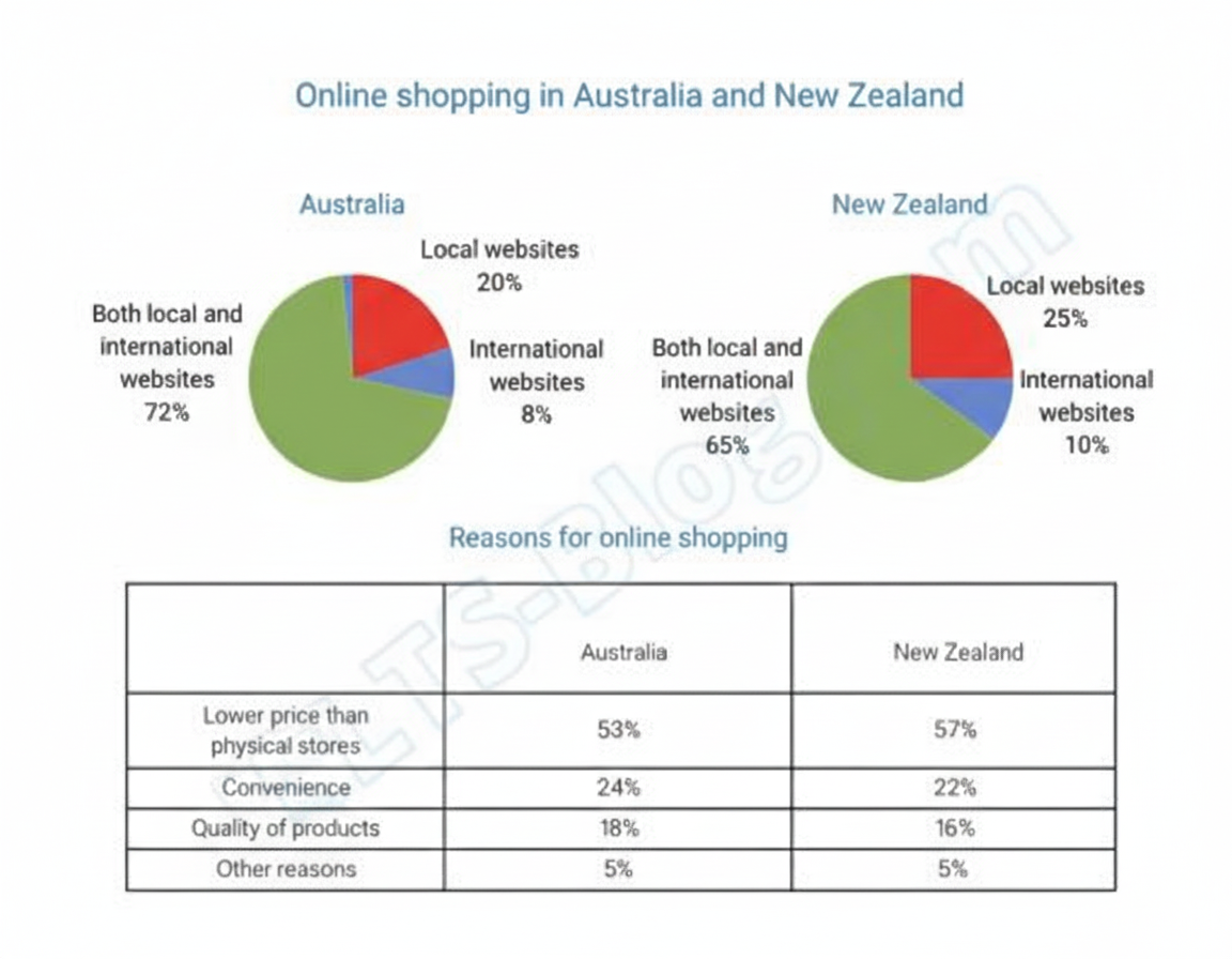 The charts below provide information about the websites where consumers from Australia and New Zealand bought products in 2012, as well as their reasons for online shopping.