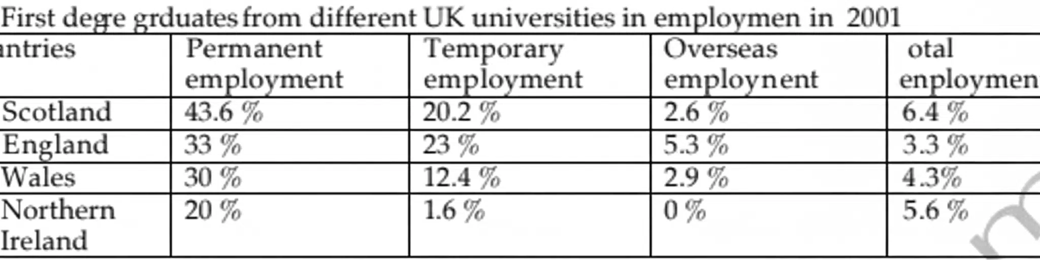 The table below shows the employment of students from four countries in the UK after their first courses in 2001.