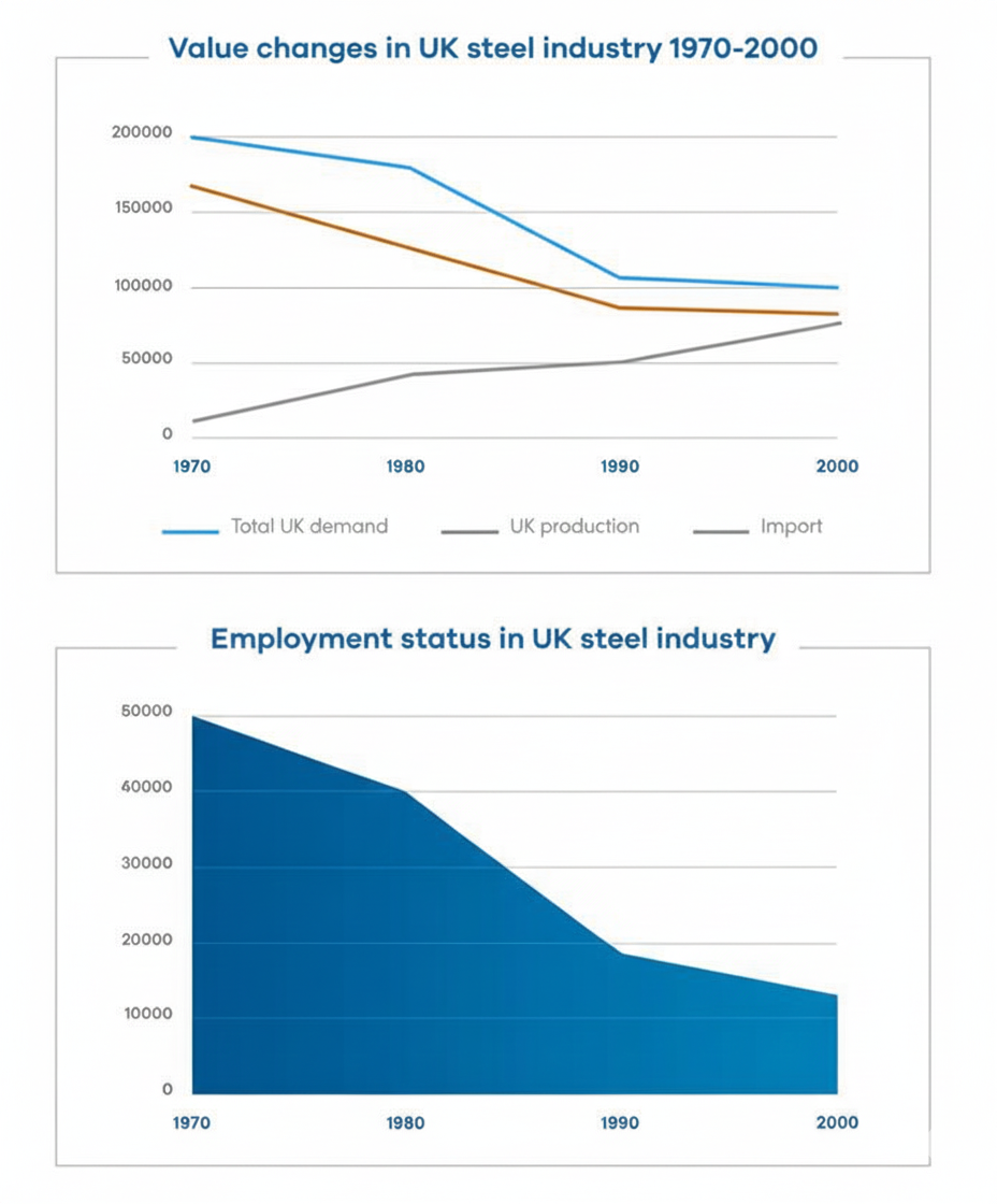 The graphs show the changes in the UK industry steel between 1970 and 2000. (million tonnes vs thousand)